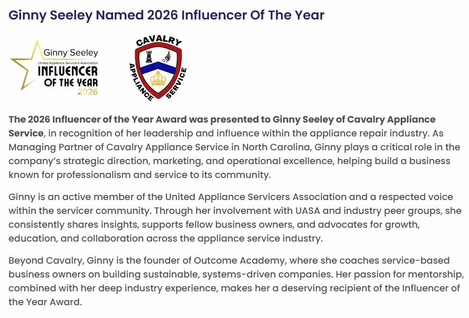Cavalry Appliance was awarded the National "Most Professional Servicer Award" for 2023 by the United Appliance Servicer’s Association for our size company category! We are so very honored!